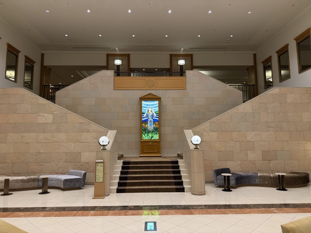 ロビーに大きく飾られてあるアイヌの少女がムックリを演奏しているステンドグラスが印象的です。