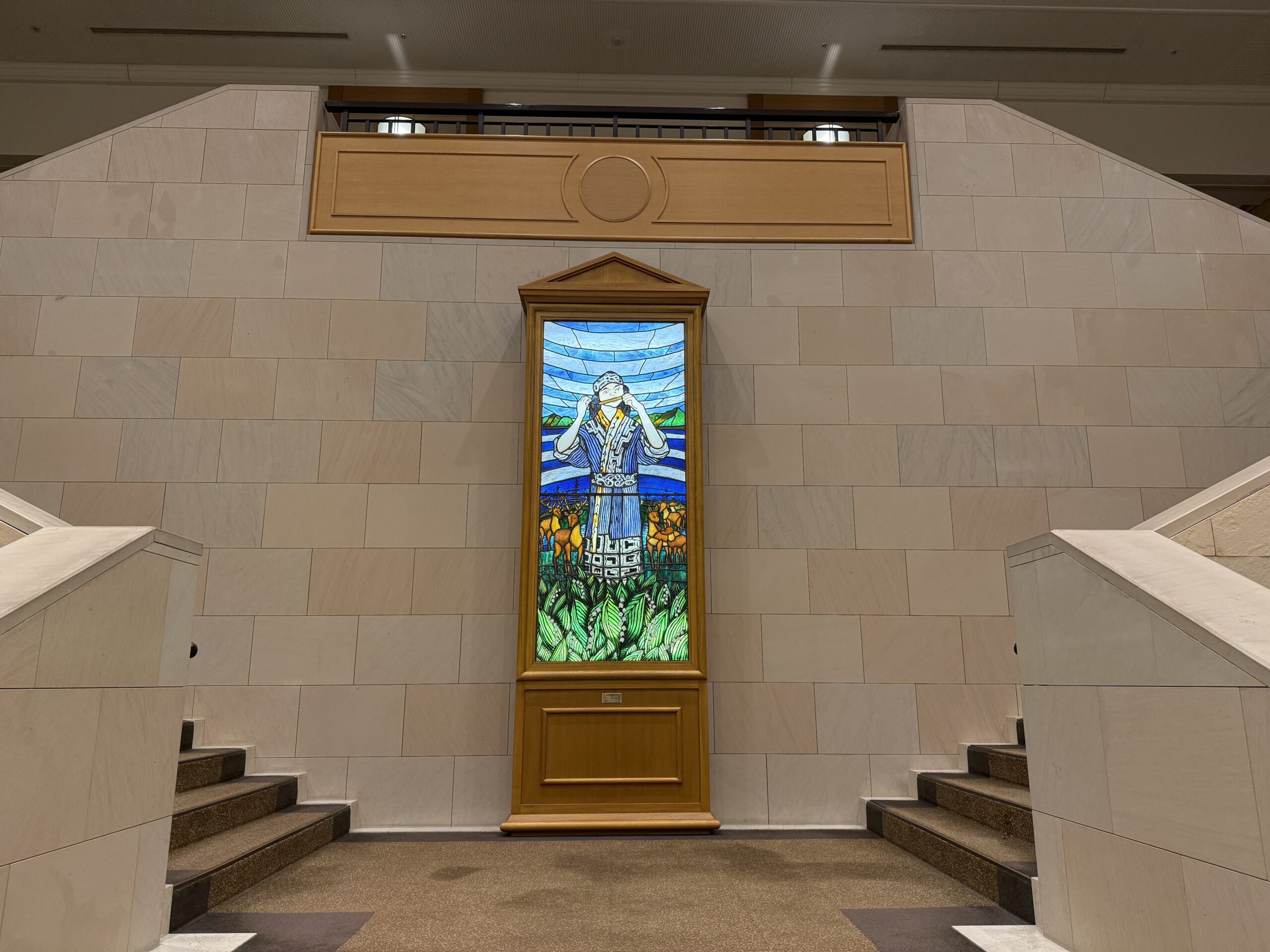 ロビーに大きく飾られてあるアイヌの少女がムックリを演奏しているステンドグラスが印象的です。