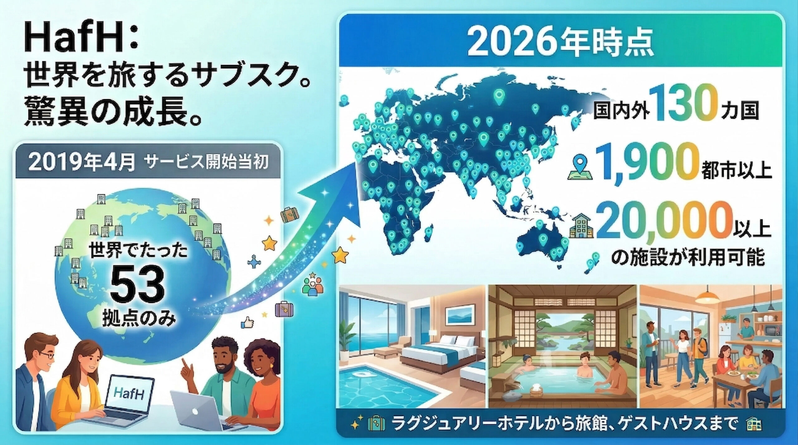 2019年4月のサービス開始当初は世界でたった53拠点のみでしたが、2026年時点では国内外130カ国、1,900都市以上、20,000以上(ラグジュアリーホテルから旅館、ゲストハウスまで)の施設が利用可能となるまでに成長しました。