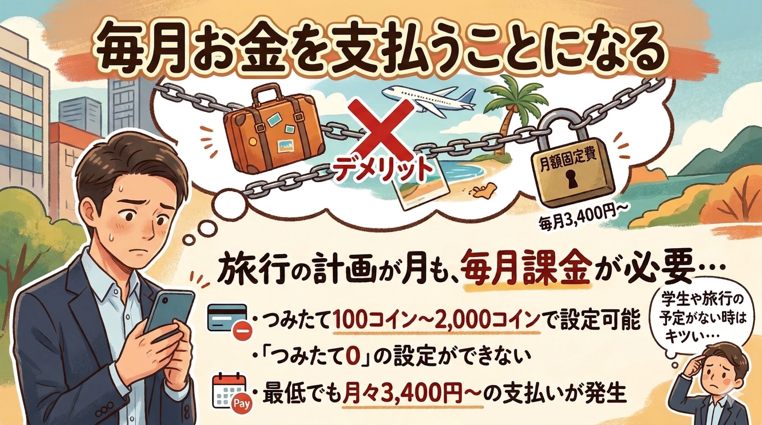 月々の月額料はつみたて100コイン〜2,000コインの間で自由に設定することができるのですが、つみたてコインを0にすることができないため最低でも月々3,400円を支払うことになります。