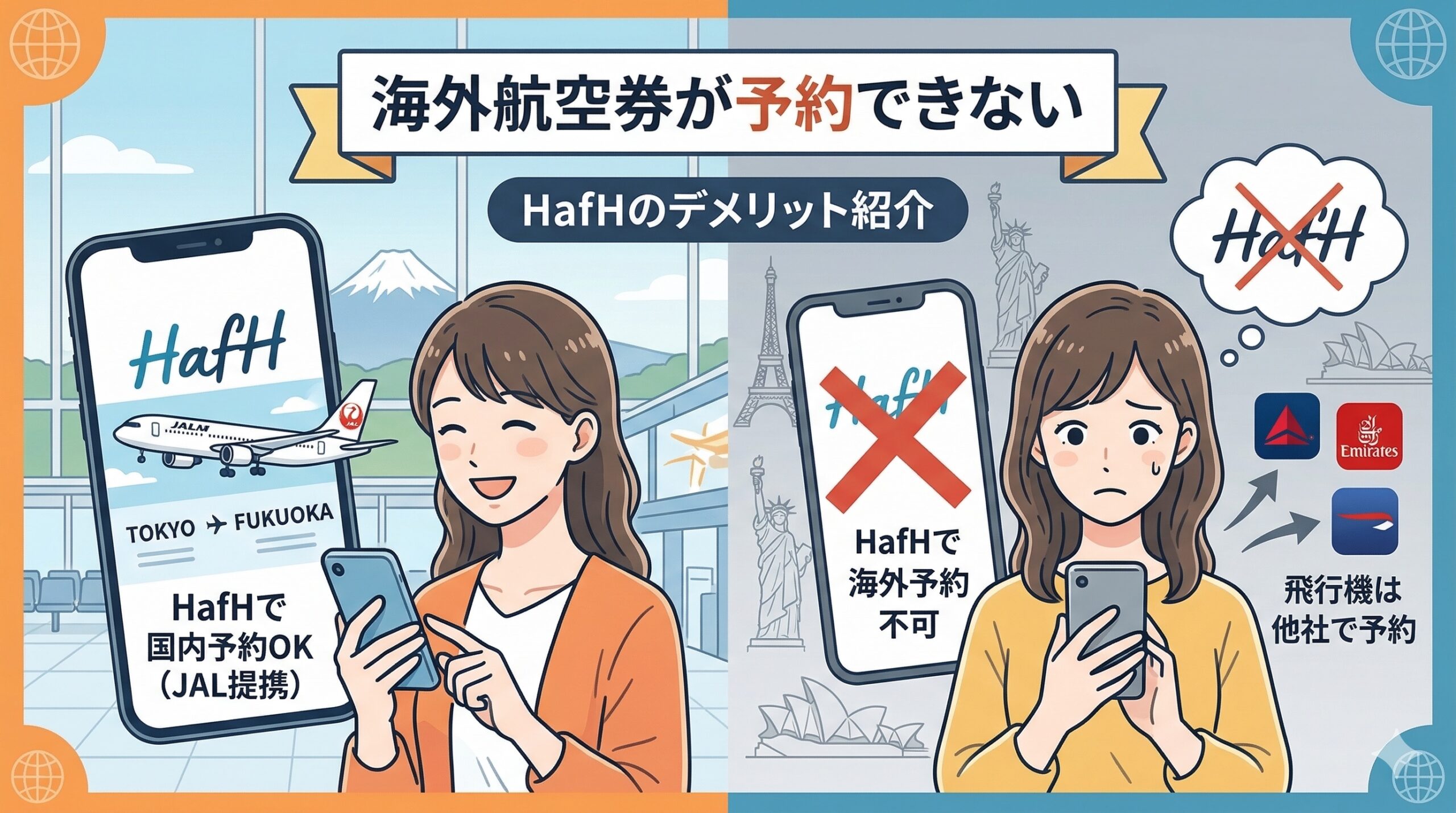 HafHはJALと提携していて国内航空券の予約が可能ですが、海外航空券は予約できません。