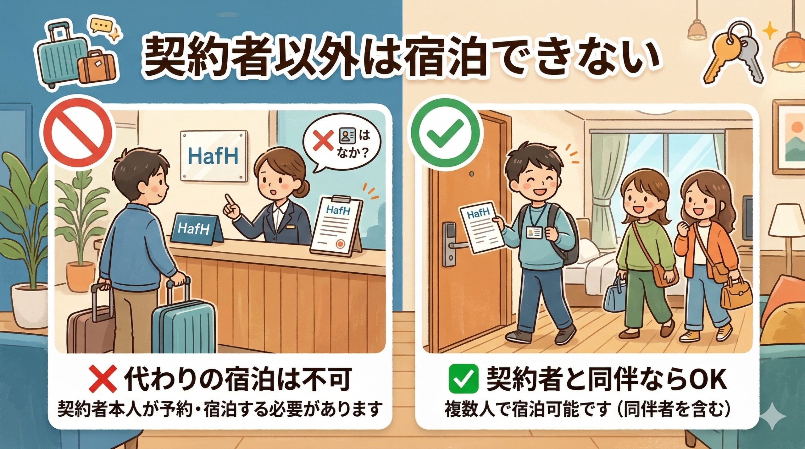 HafHは基本的に契約者本人が予約して宿泊する前提なので、代わりに契約者以外の誰かが泊まることはできません。
