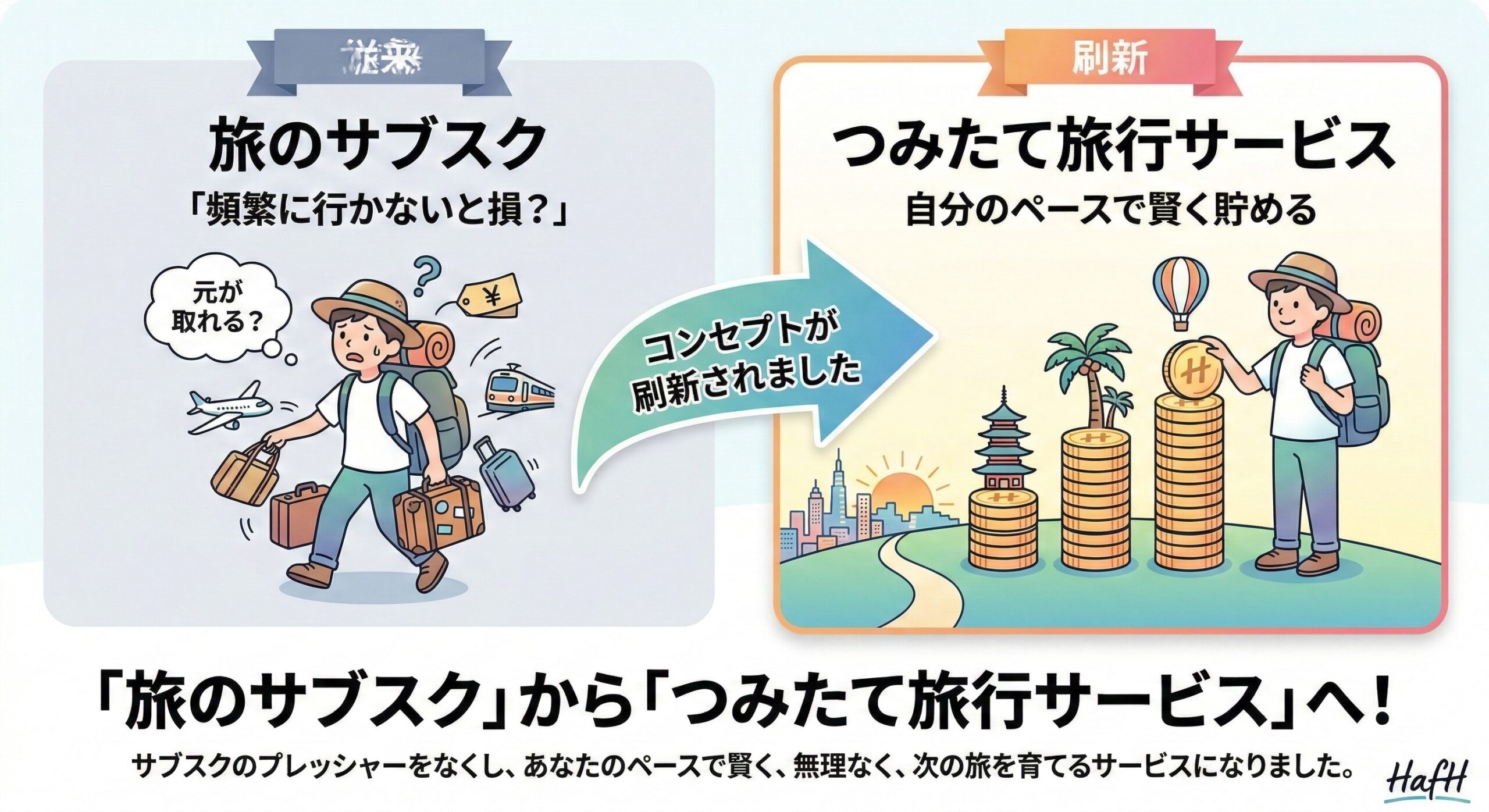従来の「旅のサブスク」から「つみたて旅行サービス」へとコンセプトが刷新されました。